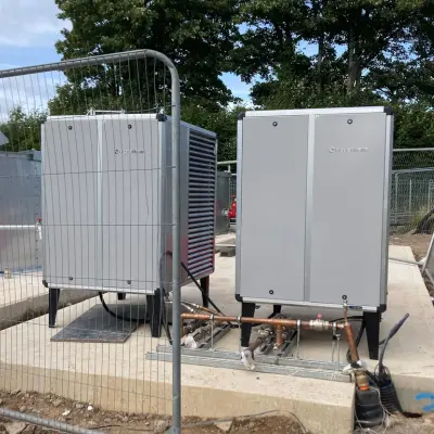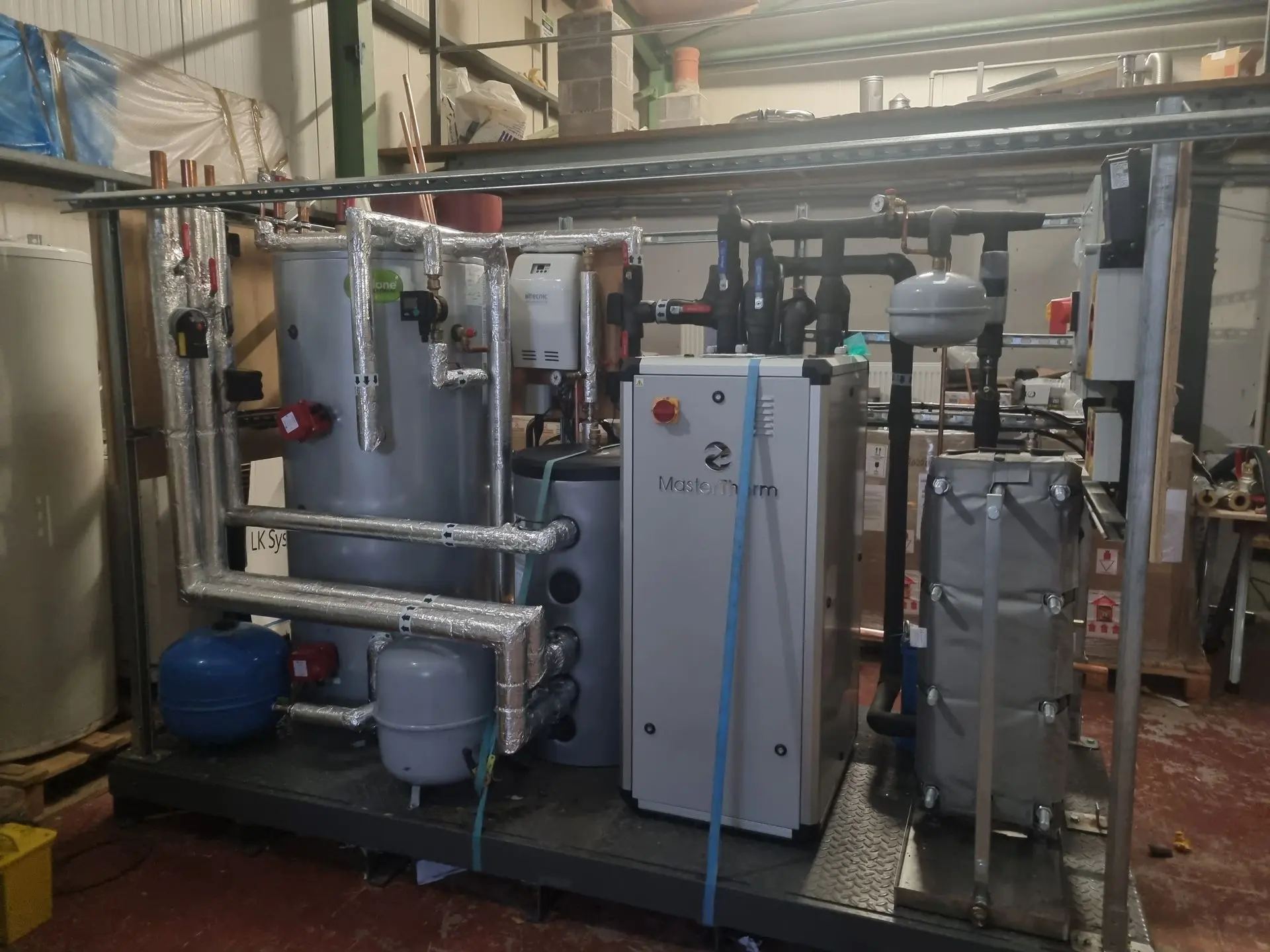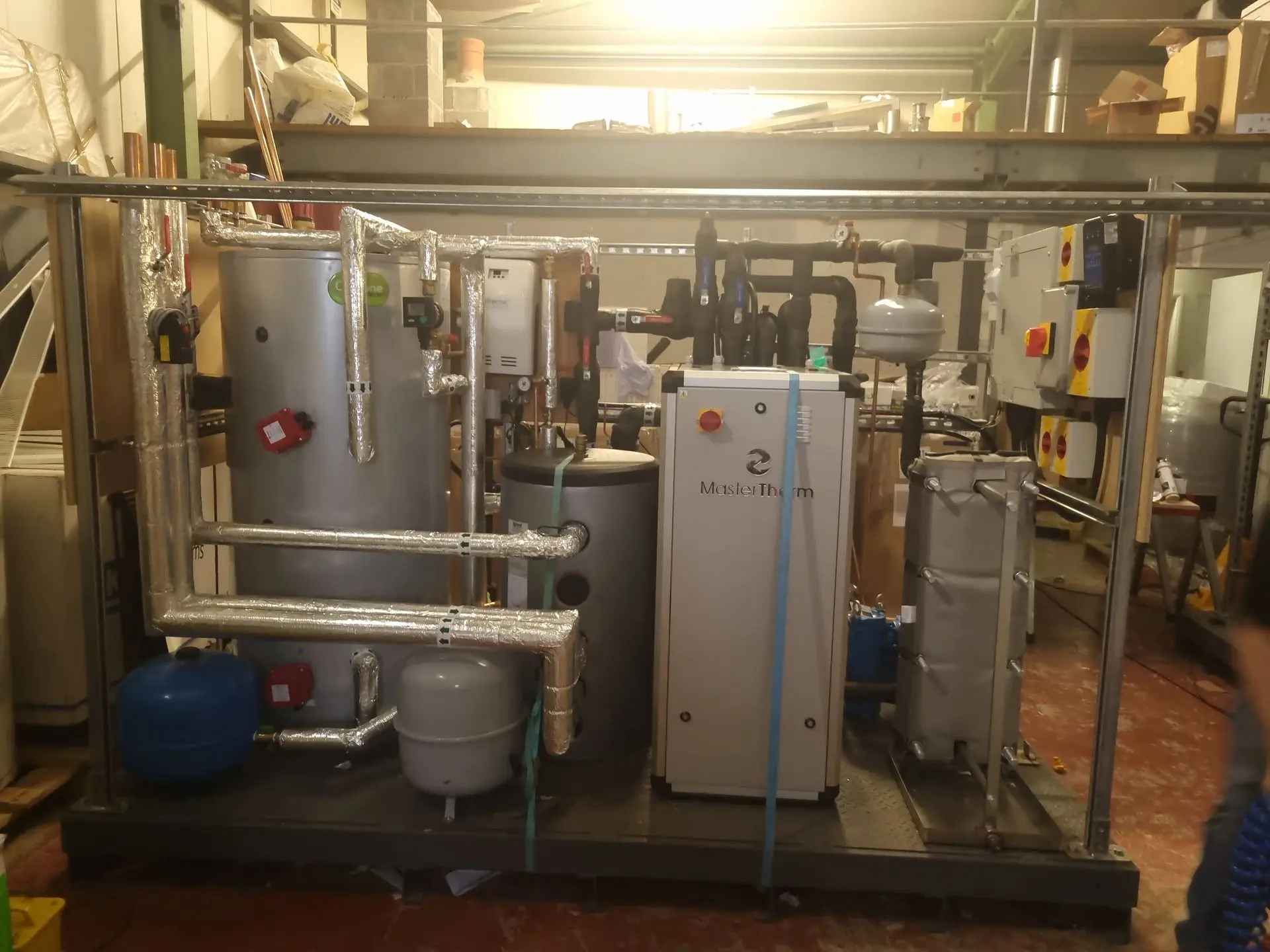 • 1 × MasterTherm AQ45i 3ph Heat Pump mounted on a bespoke skid, preassembled off-site for precise installation.