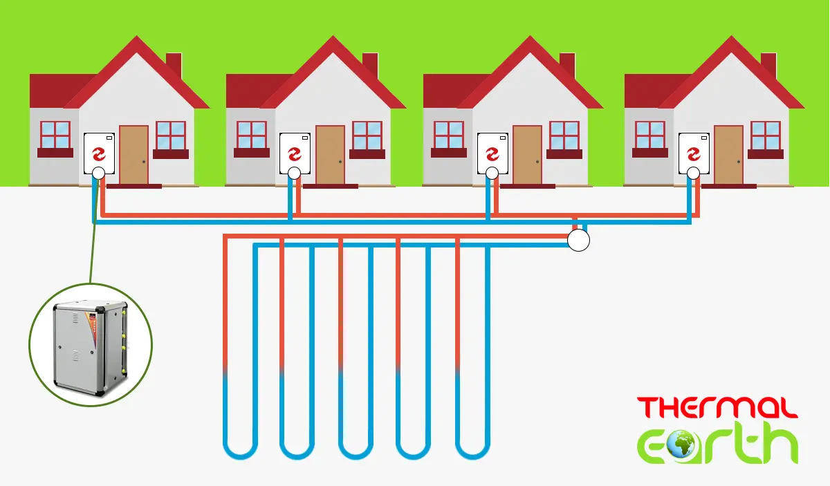 The shared ground loop is installed as a series of boreholes, central to either a community of houses or serving one large building of multiple dwellings.